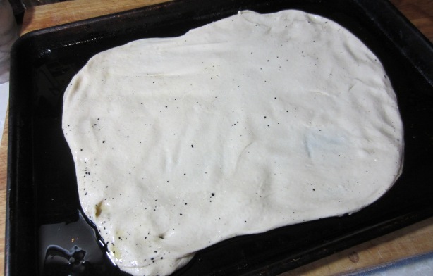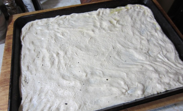 Place the remaining two tablespoons of olive oil in an 12″ x 18″ aluminum or tin sheet pan (called a ‘half sheet’ in restaurant supply stores). Do NOT use pans with non-stick coatings – they can be dangerous in high heat cooking and aren’t needed with this oil technique. Spread the dough out to cover roughly two-thirds of the pan trying to keep most of the oil underneath. It should be very simple to achieve this first stretch without overworking or fighting the elasticity of the dough. Cover loosely with plastic film and set in a warm undisturbed place (e.g. your oven with the heat off) until double in size, anywhere from 45 minutes to an hour.