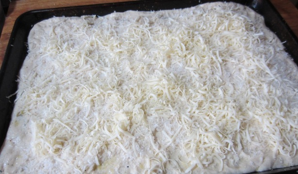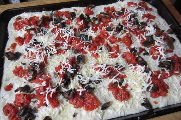 When risen, remove the film and finish pressing the dough to the edges of the pan. Again, it should be easy now that the dough has rested during the rise. Allow to sit again undisturbed for about 15 minutes. Preheat your oven to a full 260C (500F).