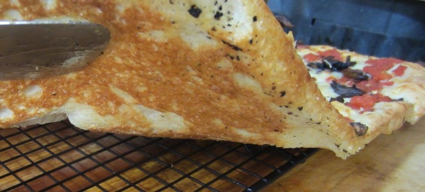 I just timed myself and ‘hands on time’ was a whopping eleven minutes. From the moment I had a pizza notion to the time I had hot pizza fresh from the oven in my mouth was just short of two hours. Is that really too much to ask, even on a weeknight? If you’re that tired, you need a new day job I say. And oh yes, it cost me a sum total of $3.89 *. Given just a few common items already in the pantry that’s pretty damn good for a huge 12″ x 18″ feast that can easily feed two hungry pizza hunters. Compare that to calling the delivery folks or buying a frozen cardboard disc and I think you might have to come over to my pizza obsessed dark side.