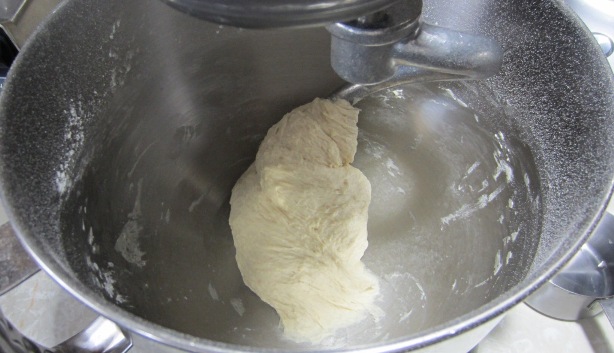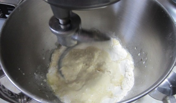 A quick note about the machine of choice here. I really like using my food processor for traditional pizza dough because it allows for significant structure development in a hurry and the subsequent long slow rise makes for tender results. For this quick version however, it seems to do more harm than good and I revert back to the trusty old upright mixer. A common mistake is to only knead the dough until it looks like a cohesive ball. That’s only half the work and you should allow the machine to continue kneading for a good eight to ten minutes in order to gently work the gluten structure. The end result will be a noticeably smooth dough that’s fairly sticky, at least until you wrestle it into the oiled pan.