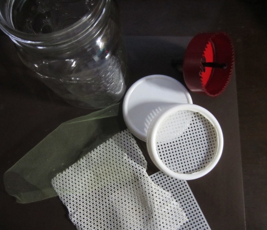 * Avoid the metal closure that probably came with the jar. It will rust in just a few days given the wet conditions of sprouting. You can however use the inner lid as a handy template for marking and cutting your mesh screen inserts.