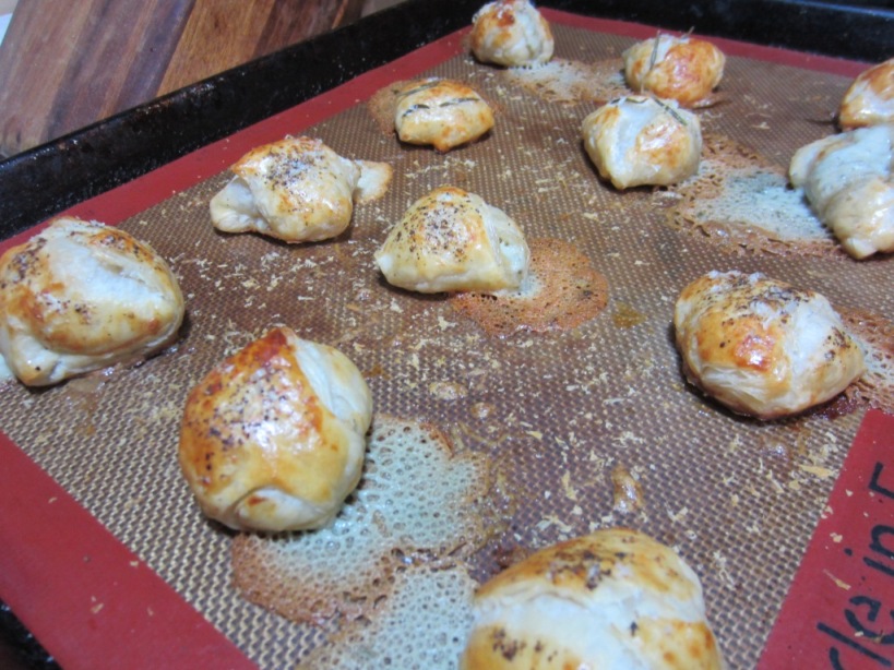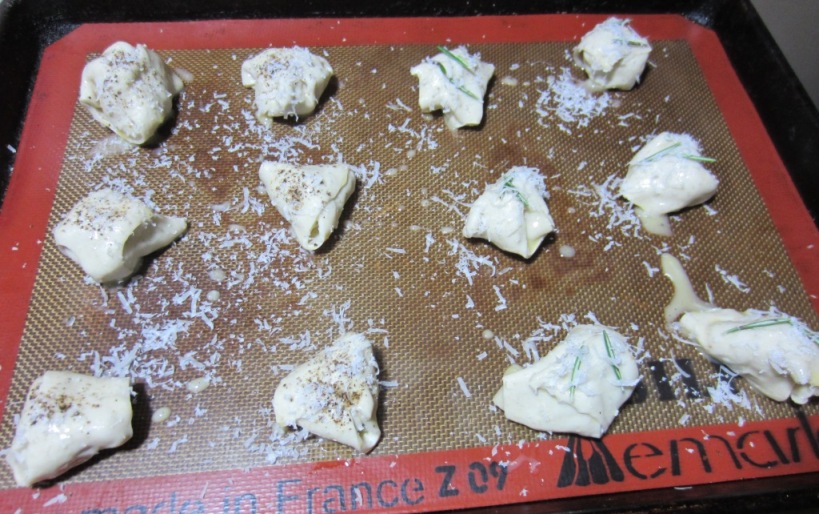 Roll the pastry out on a lightly floured board to approximately 9″ x 12″. Cut to form twelve strips, each six inches long and one and a half inches wide, i.e. two rows of six each. Divide or crumble the blue cheese into twelve equal portions, about two teaspoons each, and place on the end of each strip. Roll each strip closed somewhat haphazardly down the length turning at angles to seal in the cheese. With practice they will be a rough triangle. Place on a silicone baking mat or parchment paper set in a baking tray at least two inches apart.