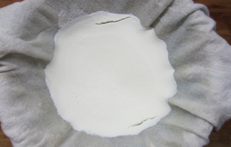 Allow to sit undisturbed for fifteen minutes then decant into the strainer lined with proper cheesecloth or a thin tea towel, either of which you’ve also remembered to sterilize. Collect the whey that drains off for other uses or proper disposal. After about half an hour most of the liquid will be separated and you can gather the corners of your cheesecloth for one last squeeze. Don’t be tempted to remove every last drop unless you want a particularly dry texture to the finished cheese.