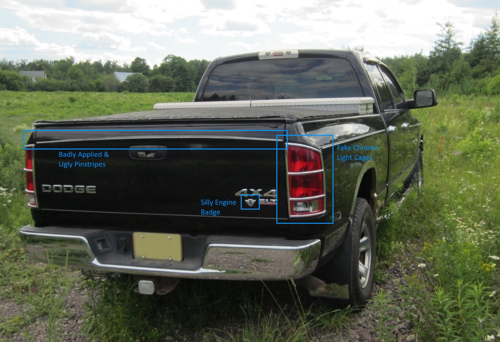 The kindly gentleman that had the truck before me I suspect bought it brand new, paid a fortune, and was very proud of the beast. Rightly so and I don’t begrudge anyone’s taste or style but it became immediately obvious that he had invested some time and money on a lot of ‘customization’. A bit too much fake chrome here and there, badly applied pinstripes which probably wouldn’t have looked good even if they were perfect, some factory flash and glitter that should never have been there in the first place – it all added up to a dated look. Like a green leisure suit four decades after disco was all the rage. I suspect in his day, this treatment was the automotive version of a west-coast hipster. Maybe it would fly in Vegas with Elvis impersonators but it certainly didn’t work here in rural Canada. Sitting next to the new year’s models as I had the dealer run the truck for recall notices*, you could see the effect was just aging the whole affair.