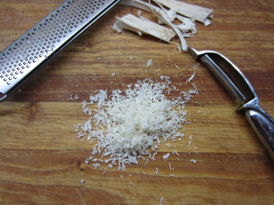The size of the roots effects the potency and while you can use harvests as young as two years old, the bigger roots that have been growing four years or longer offer more flavour and are easier to grate. The flesh is fibrous like ginger which makes a manual microplane my weapon of choice. It cuts those fibres and leaves a ‘snowflake’ texture which is ideal in recipes and exposes the most potency. Depending on the size harvest you have, resorting to the smallest work bowl of your food processor might be a better option for hard to handle roots or larger batches. Remember you’ll lose some diameter with peeling but in all cases it’s best to leave them in the ground until just before you’re ready to process.