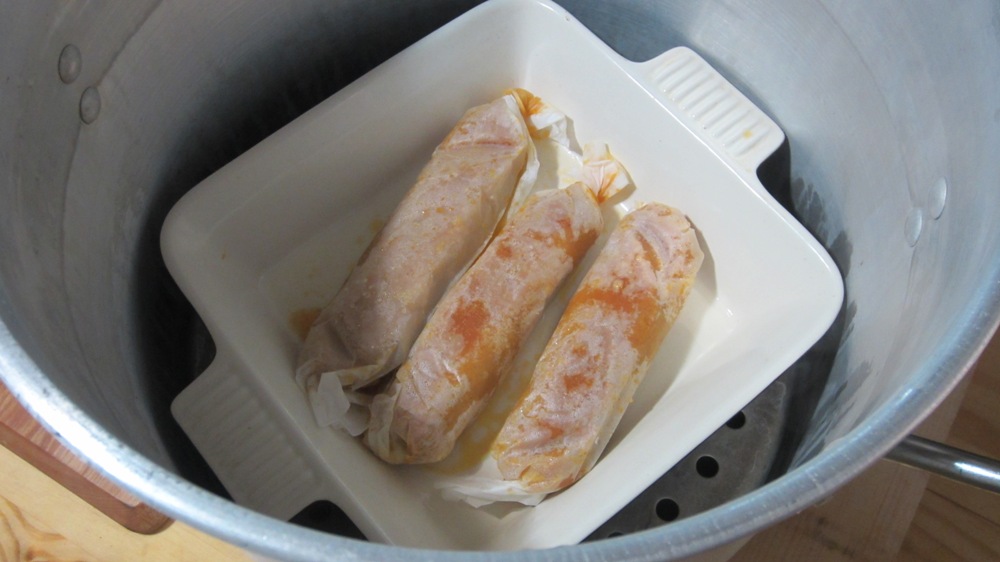 Twist or fold the ends to seal and stack horizontally in a shallow ceramic dish that will fit inside your steam pot for ease of handling. Alternate the direction when stacking multiple layers to ensure good steam flow around all. Work in batches that fit your equipment but multiple dishes can usually be stacked as long as steam will adequately surround everything. Inexpensive yet enormous steamers are easily found in any Mexican or Chinese grocery. Make dim sum next week.